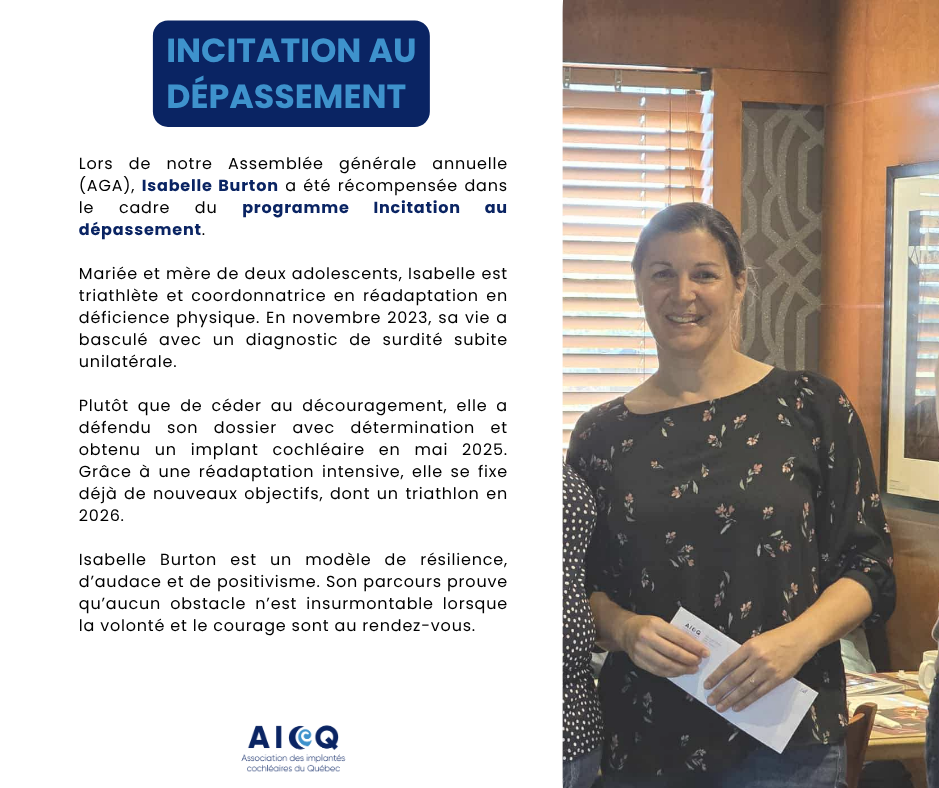 Lors de son Assemblée générale annuelle, l’AICQ a eu le plaisir de remettre la bourse Incitation au dépassement à Isabelle Burton, une femme dont le parcours est une véritable source d’inspiration.