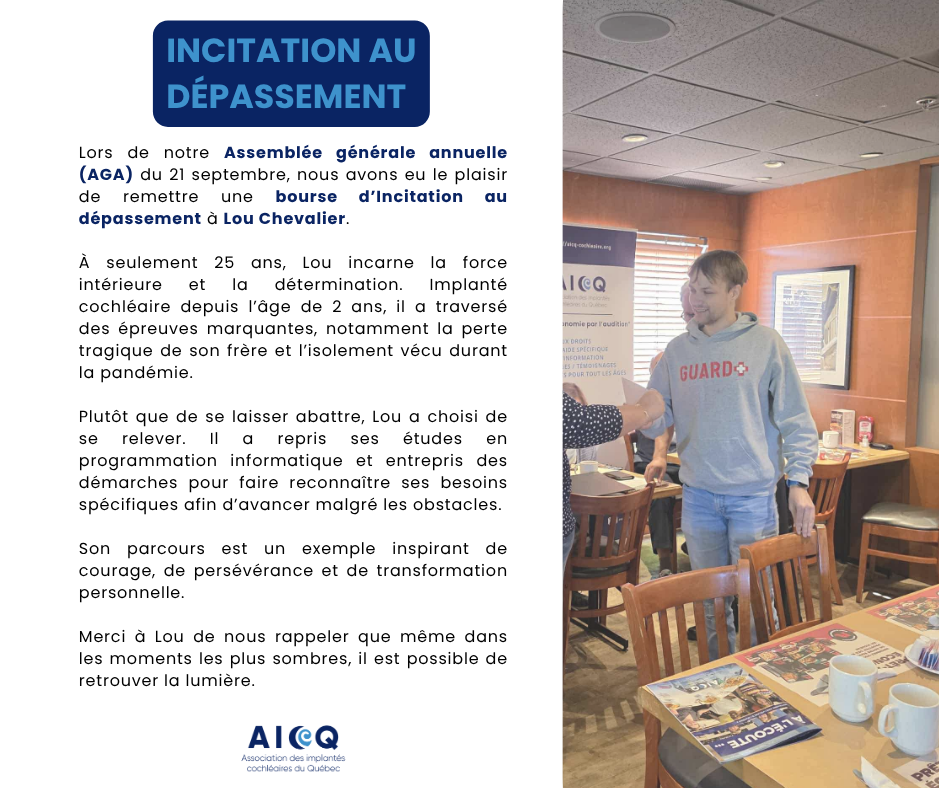 Lors de l’Assemblée générale annuelle tenue le dimanche 21 septembre, l’AICQ a remis la bourse Incitation au dépassement à Lou Chevalier, un jeune homme dont le parcours témoigne d’un courage exceptionnel.